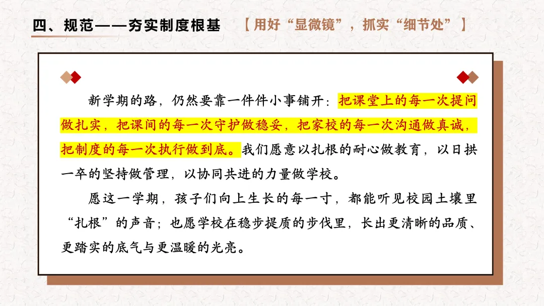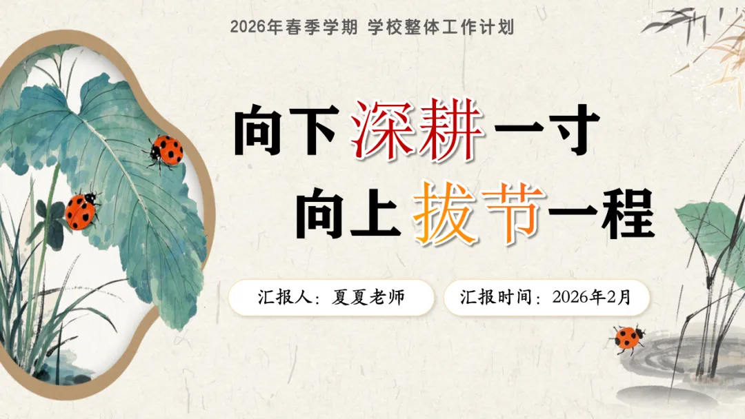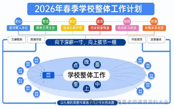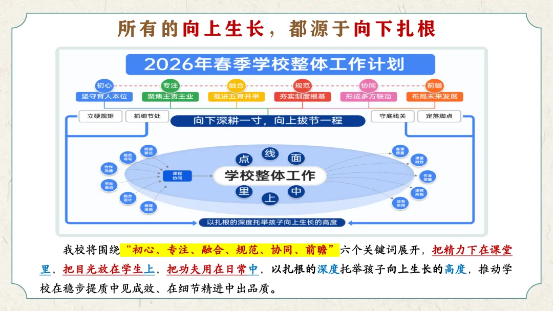 《人民日报》曾有这样一段话激励过无数奋斗者:“所有的向上生长,都源于向下扎根。”如果把学校比作一棵大树,那么课堂是年轮,学生是新芽,教师是枝干,而制度与服务,就是深埋土壤的根系不张扬,却决定着一所学校能长多稳、能长多远。我校将围绕“初心、专注、融合、规范、协同、前瞻”六个关键词展开,把精力下在课堂里,把目光放在学生上,把功夫用在日常中,以扎根的深度托举孩子向上生长的高度,推动学校在稳步提质中见成效、在细节精进中出品质。现将本学期工作计划安排如下。
