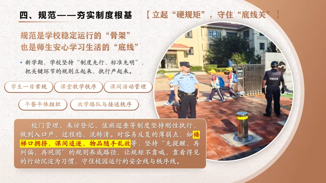 规范是学校稳定运行的“骨架”,也是师生安心学习生活的“底线”。新学期,学校坚持“制度先行、标准先明”,把关键环节的规则立起来、执行严起来。围绕学生一日常规、课堂教学秩序、课间活动管理、午餐午休组织、放学路队与接送秩序等重点领域,进一步细化岗位要求和操作流程,做到“事有标准、岗有要求、人有职责”。校门管理、来访登记、值班巡查等制度坚持刚性执行,做到入口严、过程稳、流转清。对容易反复的薄弱点,如楼梯口拥挤、课间追逐、物品随手乱放等,坚持“先提醒、再纠偏、再巩固”的规则养成路径,让规矩不靠喊、靠看得见的行动沉淀为习惯,守住校园运行的安全线与秩序线。