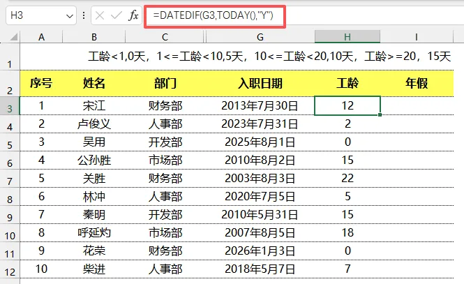 假设你的表格中,G列是入职日期(比如G3单元格是某员工的入职日期),在空白单元格(比如H3)输入以下公式,按回车即可算出该员工的整年工龄:=DATEDIF(G3,TODAY(),"Y")DATEDIF函数:Excel专门用来计算两个日期之间差值的函数TODAY():自动获取当前系统日期,不用手动输入,后续日期会自动更新"Y":参数表示“计算整年差值”,只保留整数年份(比如入职2年3个月,会计算为2年)操作:输入公式后,下拉填充,就能批量算出所有员工的工龄啦~第二步:根据工龄,计算年假天数