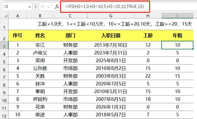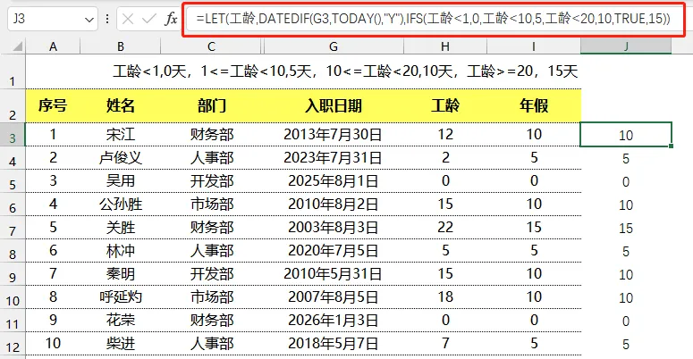 工龄已经算好在H列(比如H3是工龄),在另一空白单元格(比如I3)输入以下公式,按回车即可得出年假天数:=IFS(H3<1,0,H3<10,5,H3<20,10,TRUE,15)IFS函数:多条件判断函数,比多个IF函数嵌套更简洁,不用层层嵌套绕晕自己H3<10,5:如果工龄大于等于1年、小于10年,年假为5天(不用额外写H3≥1,IFS会按顺序判断)H3<20,10:如果工龄大于等于10年、小于20年,年假为10天TRUE,15:其余所有情况(也就是工龄≥20年),年假为15天(TRUE相当于“否则”)操作:输入公式后,下拉填充,批量生成所有员工的年假天数,核对无误就完成啦!=LET(r,DATEDIF(G3,TODAY(),"Y"),IFS(r<1,0,r<10,5,r<20,10,TRUE,15))LET函数:Excel 365及以上版本支持的函数,作用是“给公式中的中间变量命名”,简化公式,避免重复计算r,DATEDIF(...):给“工龄”这个中间变量命名为r(可以随便命名,比如a、gll都可以),后面直接用r代替重复的工龄计算公式后面的IFS函数,和方法一中的逻辑完全一致,只是把H3换成了我们命名的变量r常见问题&注意事项