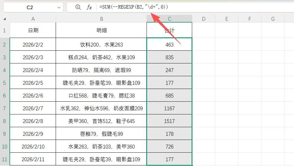 这时可以先在单元格中输入一个字母+求和公式,之后选中区域按Ctrl+E获取全部结果,之后选中区域按Ctrl+H打开查找和替换对话框,在查找中输入字母A,随后再替换中输入“=”,点击全部替换即可获取结果。如果在WPS中,这时可以直接输入公式=SUM(--REGEXP(B2,"\d+",0)),向下填充即可获取结果。