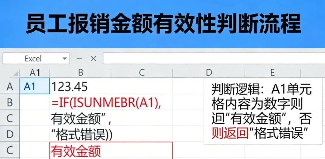 举个小例子:A1:A30是员工报销金额(部分单元格误录入文本、空值),想快速判断是否为有效数字,输入公式=IF(ISNUMBER(A1), "有效金额", "格式错误"),如果A1是数字(比如286、350.5),就显示“有效金额”;如果是文本(比如“两百”)或空值,就显示“格式错误”,一键区分,再也不用手动逐行核对!