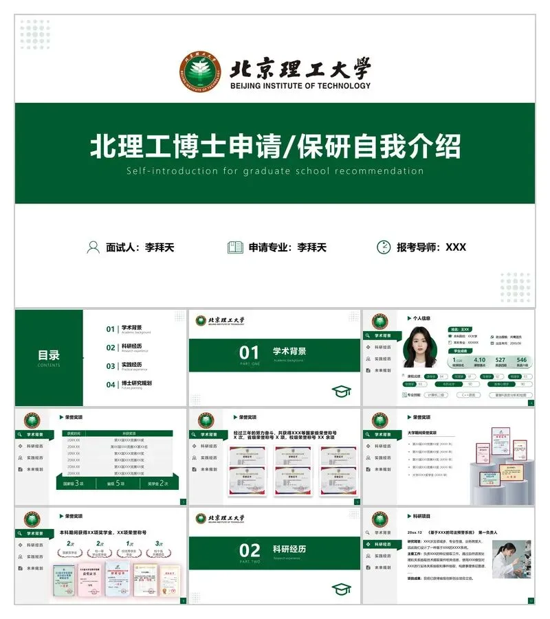 这套模板以深绿色主调搭配北理校徽,整体沉稳大气,非常贴合学术汇报的正式感。