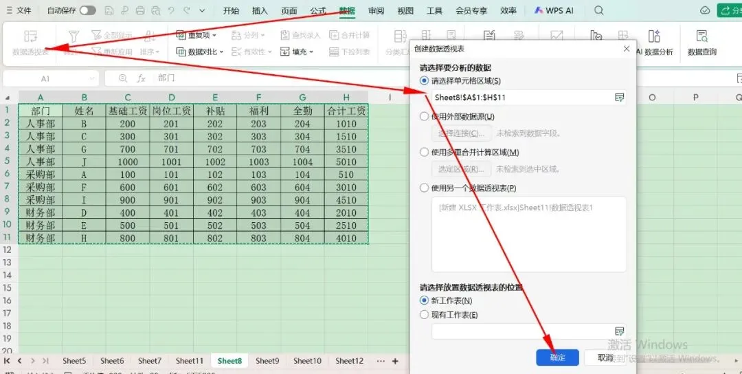 首先,建立一个数据透视表,先选中表格中的所有区域,点击“数据”,再点击“数据透视表”,确认区域无误后,点击“确定”。