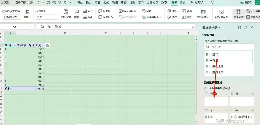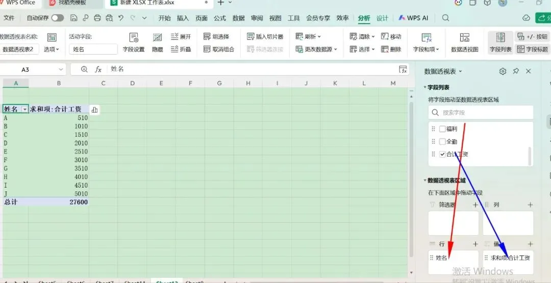 再透视一下,将“字段列表”里的“姓名”拖到“行”那里,将“字段列表”里的“合计工资”拖到“值”那里,即生成了左边的一个透视表格。