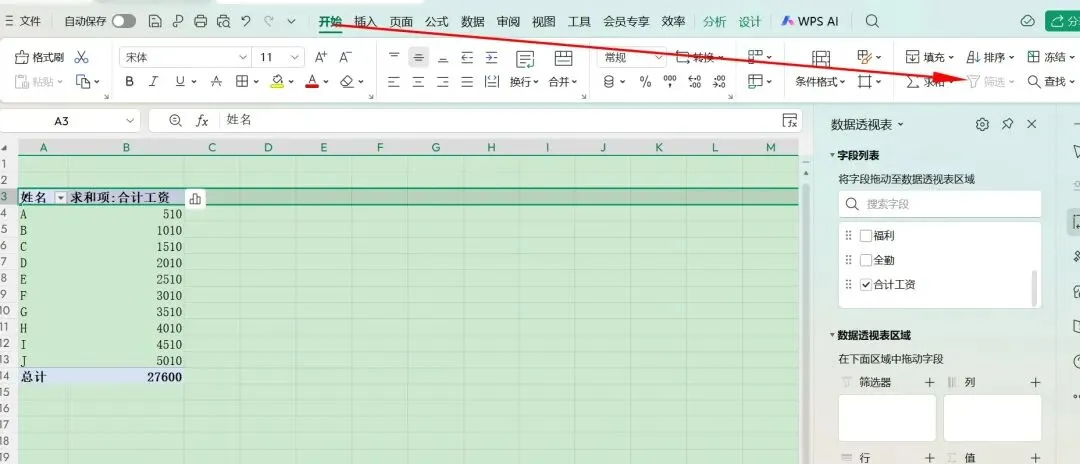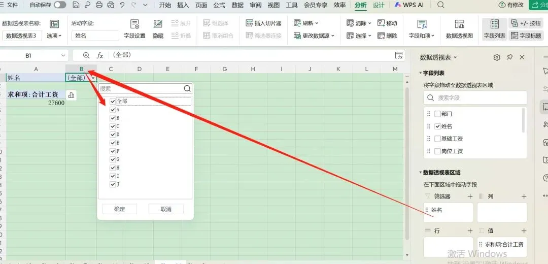 那么,现在开始学习如何直接对数据透视表进行筛选,先将“字段列表”里的“姓名”拖到下面的“筛选器”里。
