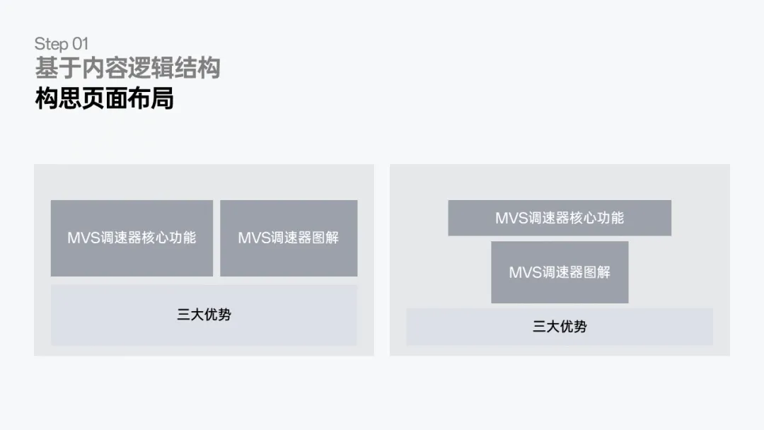其实主要讲核心功能和三大优势,所以内容布局无非就是两种方式,选择其中一种先敲定页面布局: