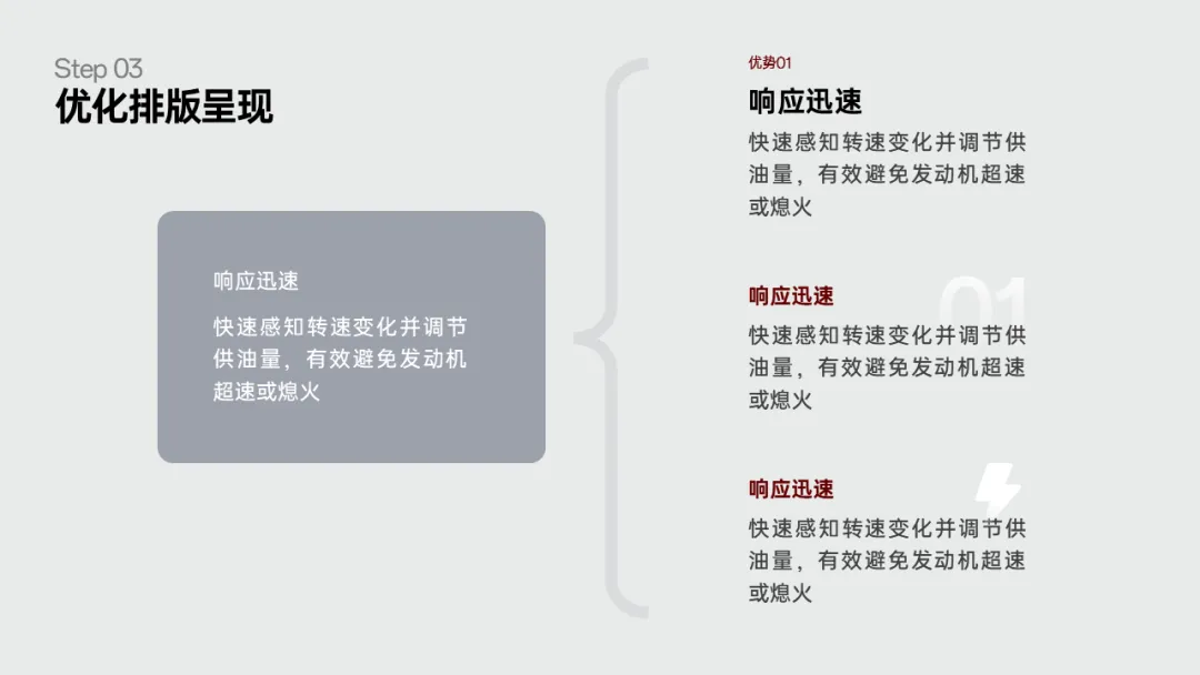 完成这一步之后,我们只需要对PPT页面的文字段落,进行简单排版调整,核心还是增加信息的对比: