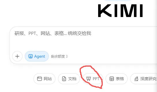 首先打开Kimi官网:https://www.kimi.com。在对话框上方找到并点击“Agent”按钮,进入功能列表后,选择"PPT"助手。这个专用模式能让Kimi后续的生成更贴合PPT格式。