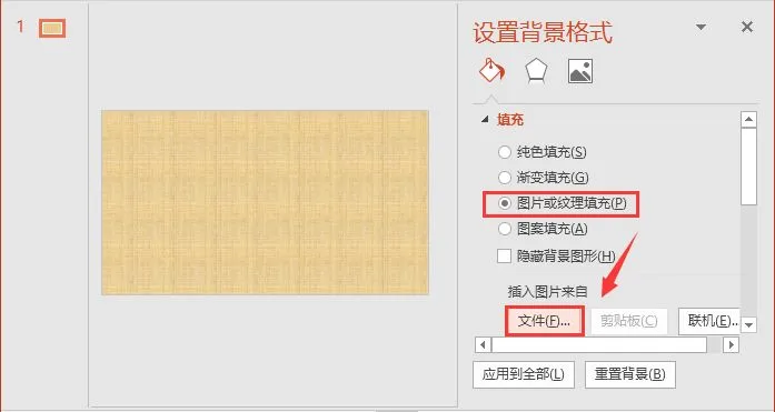 (2)打开 “设置背景格式”任务窗格,在“填充”栏中选中“图片或纹理填充”选项。再点击“文件”按钮。