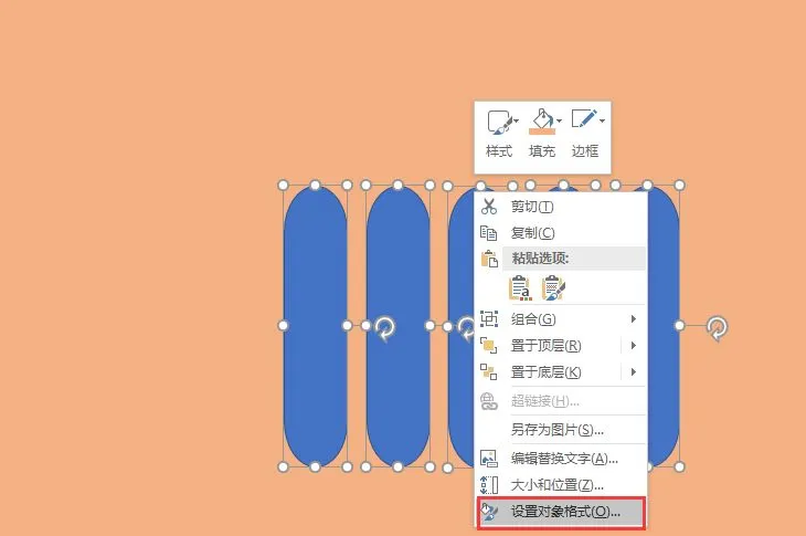 (4)在最上方插入5个圆角矩形,放置于右下角。在形状上单击鼠标右键,在弹出的快捷菜单中选择“设置形状格式”。