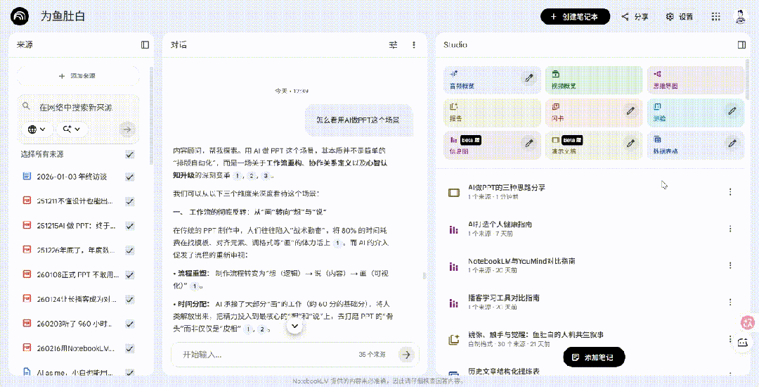 直接把内容给NotekookLM,几分钟就能生成一份演示文稿。能用、能讲、能让听众理解。