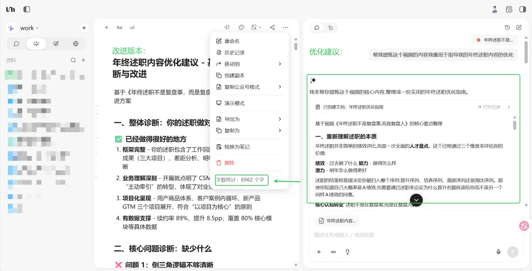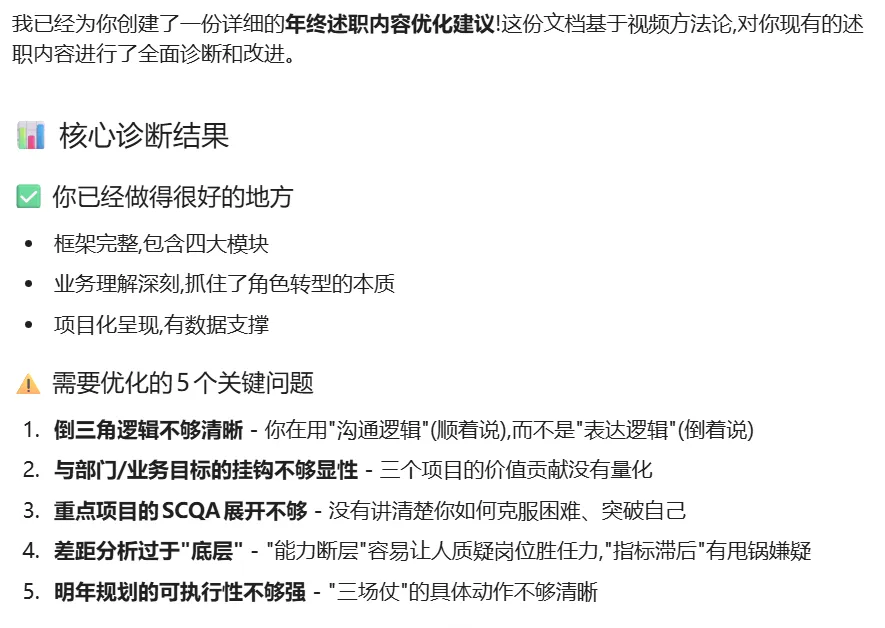 将视频给到Youmind,提炼成一份实用的述职汇报优化建议,直接对我的初稿提了6000多字的改进建议😰