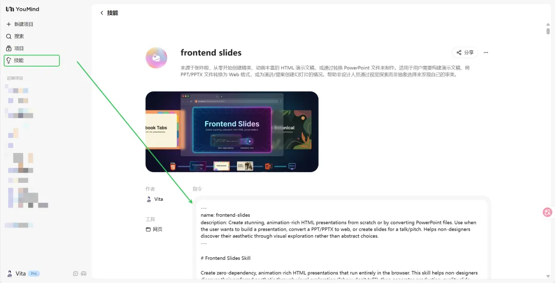 看到要部署 Claude code、SKILL 即将被劝退了,想到 Youmind 也可以调用 SKILL,0门槛复制粘贴成 frontend-slides SKILL,调用一次消耗了 600多积分,比生成图片还省。