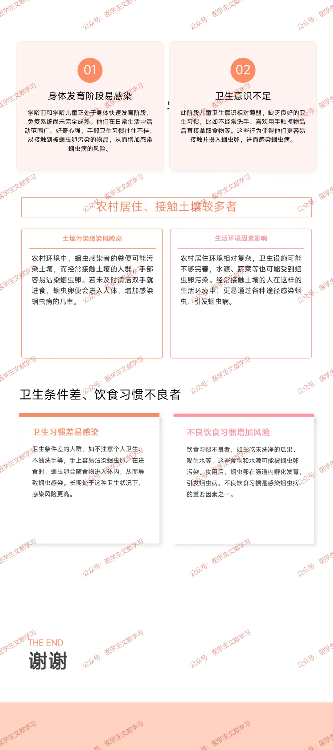 - 高危人群:儿童(免疫力低、卫生意识弱)、卫生习惯差者、农村居住且接触土壤较多者、卫生条件与饮食习惯不良者。
