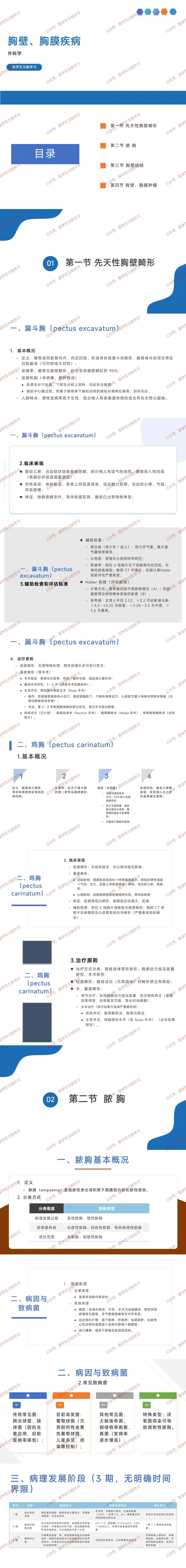 - 治疗:核心原则为手术消灭病因与脓腔,促肺复张;手术方法(胸膜纤维板剥脱术:主流,胸腔镜创伤小,不适用于纤维板过厚、肺纤维化等情况;胸廓成形术:适用于复杂脓胸,创伤大、已少用;胸膜全肺切除术:适用于合并严重肺病变,技术要求高、创伤重)。