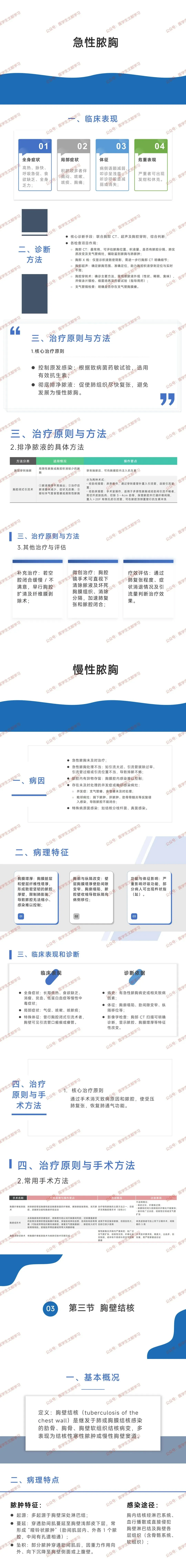 - 治疗:核心原则为控制原发感染(按药敏选抗生素)、彻底排脓(促肺复张,防慢性化);排脓方法(胸腔穿刺抽脓:适用于局限 / 积液少的脓胸,抽后注抗生素;胸腔闭式引流术:适用于脓液稠厚、治疗无效等情况,分经肋间插管、经肋床插管);其他(空腔闭合慢则早行扩清 + 纤维膜剥除术;胸腔镜手术清除脓液及坏死组织;按肺复张、症状、引流量评估疗效)。