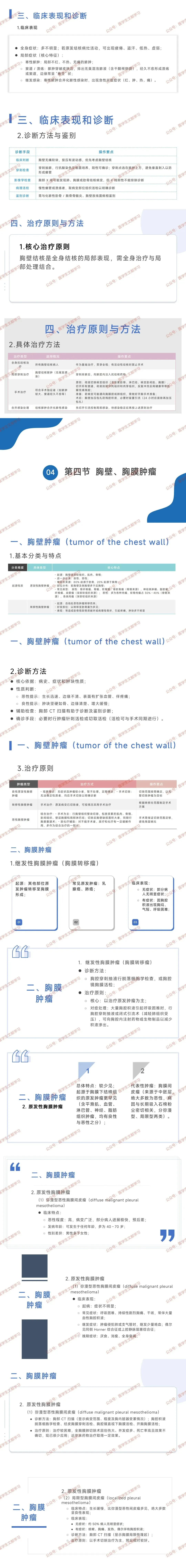 - 治疗:良性(无症状小肿瘤随访,性质不明者手术切除);转移性(原发病灶切除后,视情况手术);恶性(综合治疗,以手术为主,切除受累组织,缺损大则同期胸廓重建,不能手术者用放化疗辅助)。