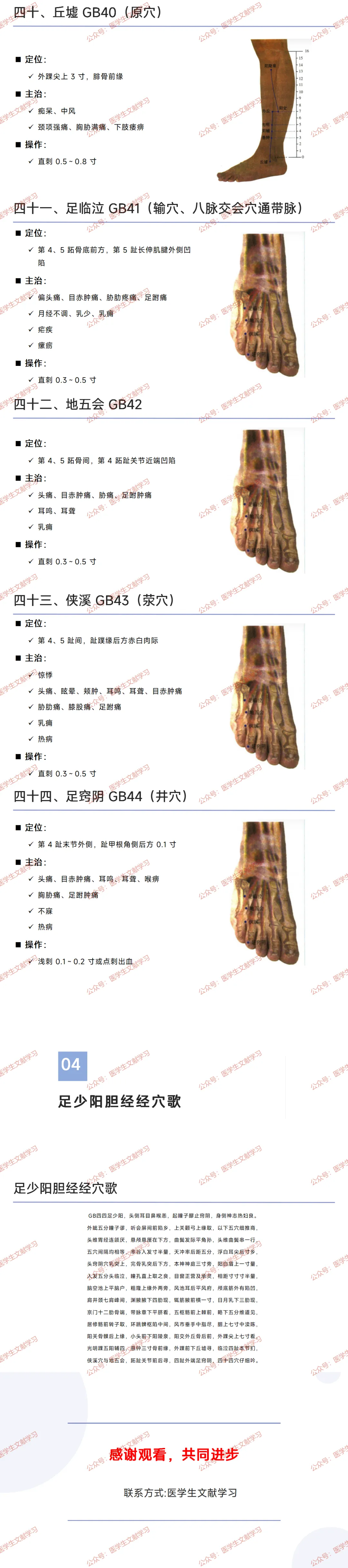 - 足窍阴(GB44,井穴):第 4 趾末节外侧,趾甲根角侧后方 0.1 寸,主治头痛、目赤肿痛等,浅刺 0.1~0.2 寸或点刺出血。