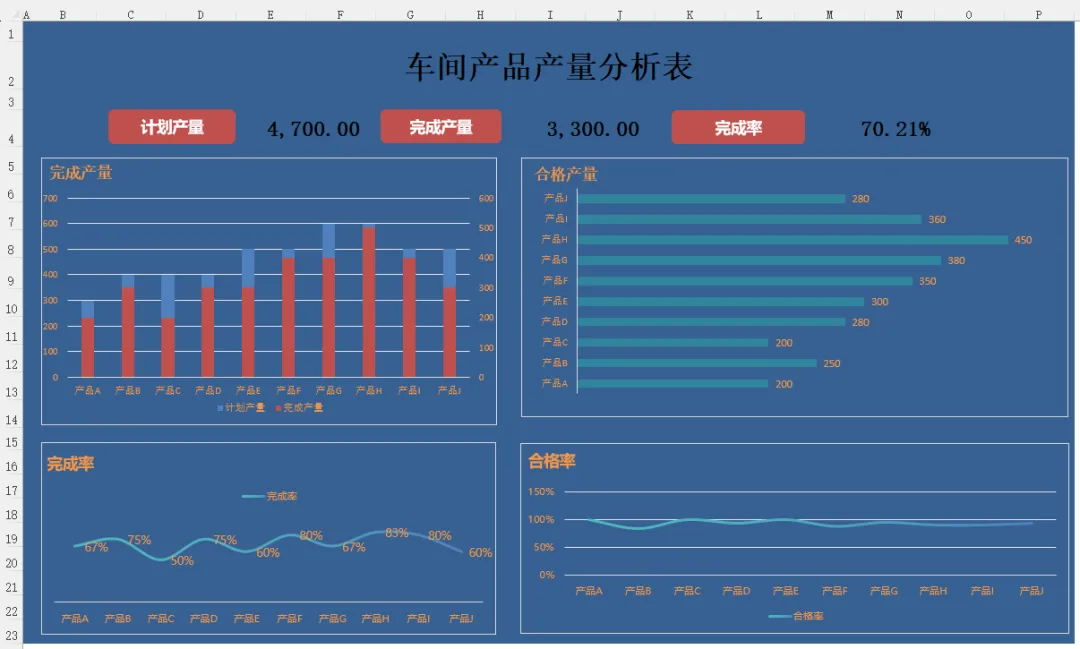 ✅ 结构清晰,适合多产品对比支持多种产品的数据录入,涵盖计划产量、完成产量、合格产量等核心指标,方便横向对比各产品表现。