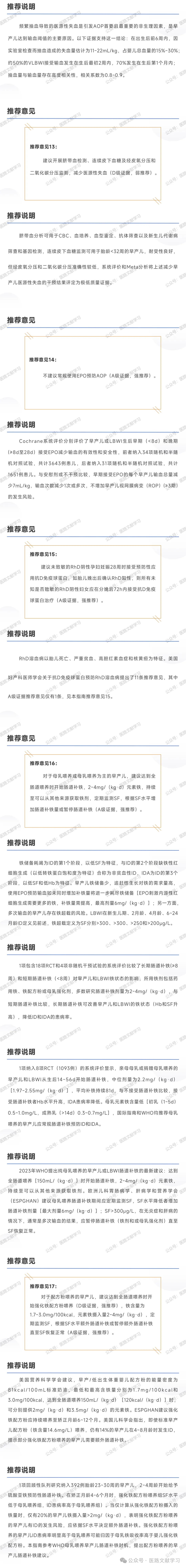 建议所有早产儿,不论喂养方式,从生后 6 月龄开始引入富含铁辅食(A 级证据,强推荐)