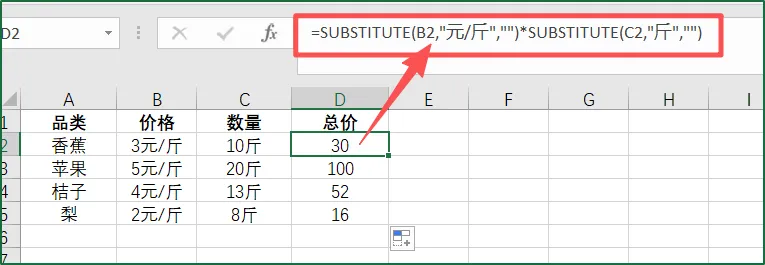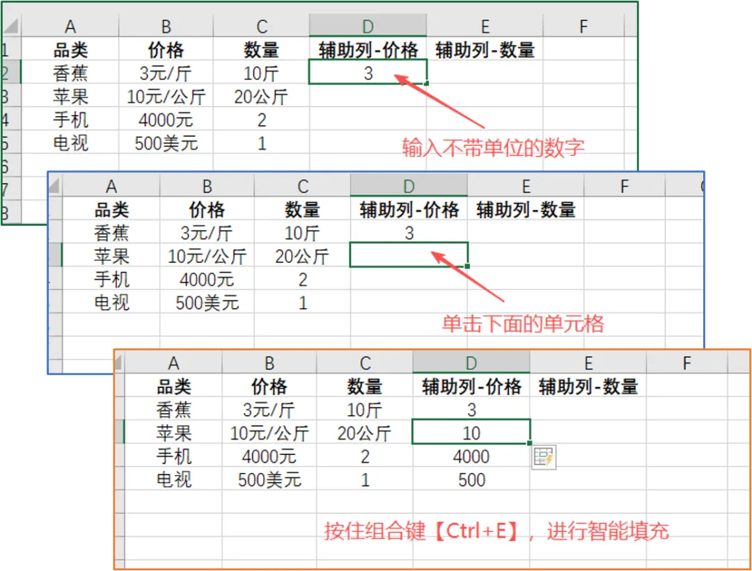 ②在【辅助列-价格】第一个单元格中输入不带单位的数字;
