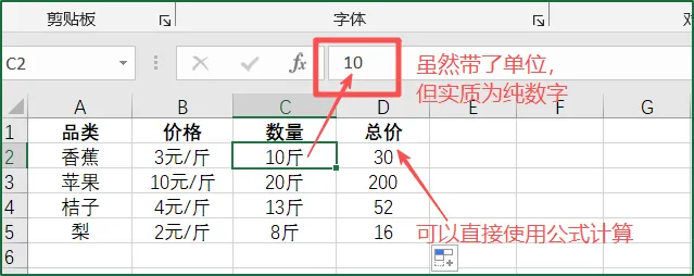 检查方法:直接单击“带单位”的数字,观察编辑栏是否为纯数字。