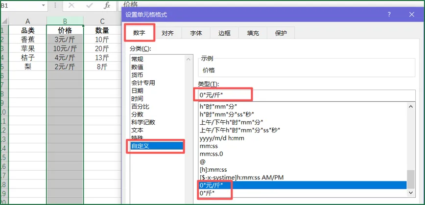 ③在编辑框中输入显示格式,如【0"元/斤"】、【0"斤"】。