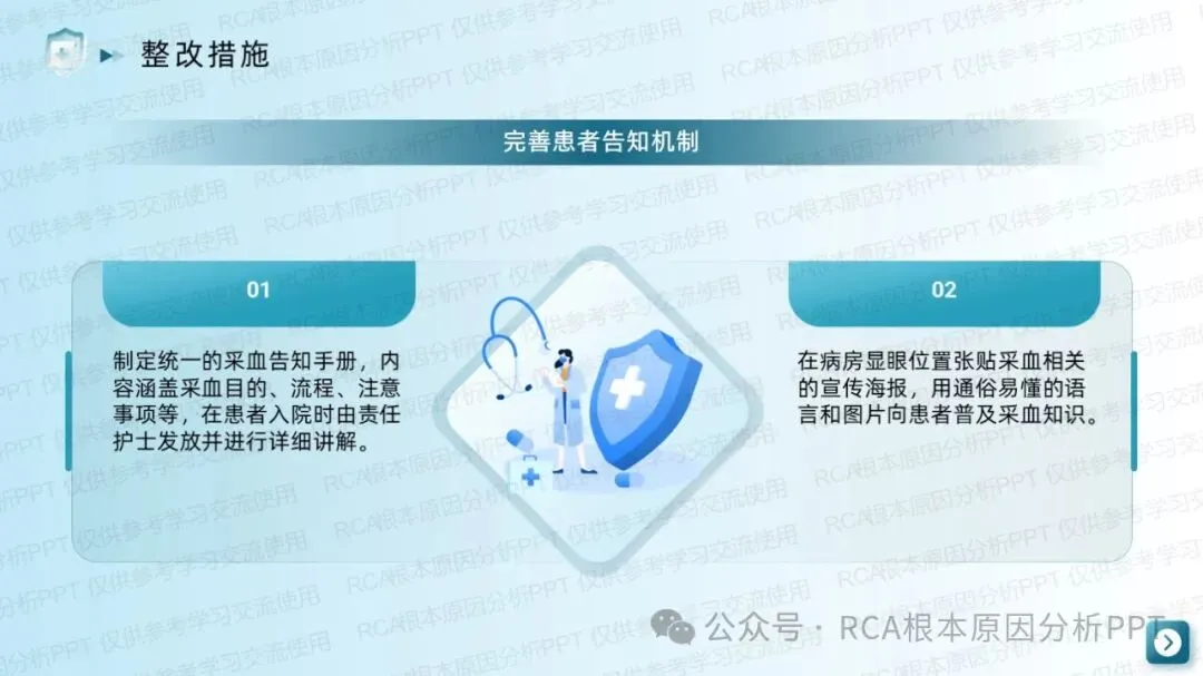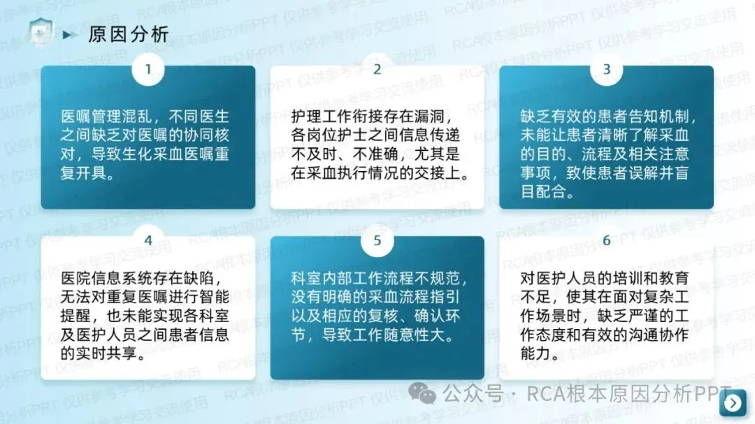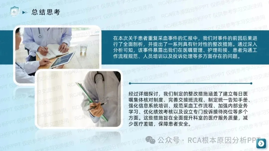 在本次关于患者重复采血事件的全面剖析中,我们清晰地认识到该事件所暴露出的在医嘱管理、护理衔接、患者沟通、工作流程规范、人员培训以及投诉处理等多方面的问题。经过深入探讨,我们制定的一系列整改措施涵盖了建立每日医嘱集体核对制度、完善交接班流程、制定统一告知手册、强化信息系统培训、规范采血工作流程、加强内部业务学习、优化绩效考核以及设立专门投诉接待岗位等多个关键环节。这些措施对于全面提升科室的服务质量、减少医疗差错、保障患者安全具有重要意义。