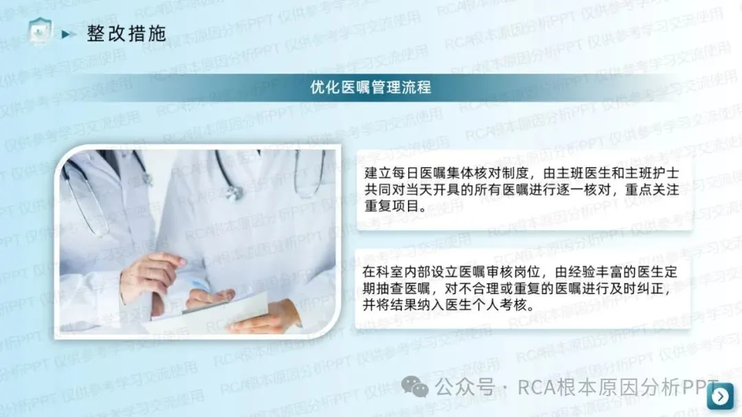 建立每日医嘱集体核对制度,由主班医生和主班护士共同对当天开具的所有医嘱进行逐一核对,着重关注重复项目,确保医嘱的准确性。