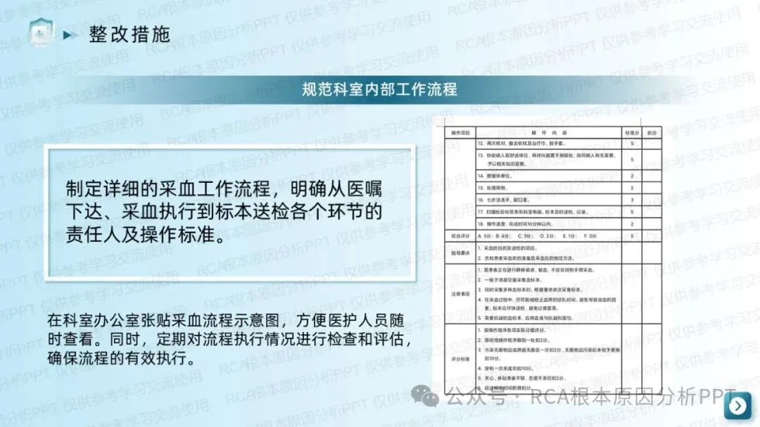 在科室办公室张贴采血流程示意图,方便医护人员随时查看。同时,定期对流程执行情况进行检查和评估,确保流程的有效执行,及时发现并纠正不规范行为。