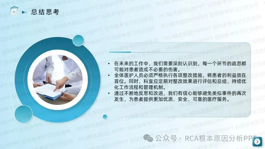 在未来的工作中,全体医护人员必须深刻认识到每一个工作环节的重要性,严格执行各项整改措施,始终将患者的利益放在首位。同时,科室应定期对整改效果进行评估和总结,持续优化工作流程和管理机制,通过不断地反思和改进,努力避免类似事件的再次发生,为患者提供更加优质、安全、可靠的医疗服务。