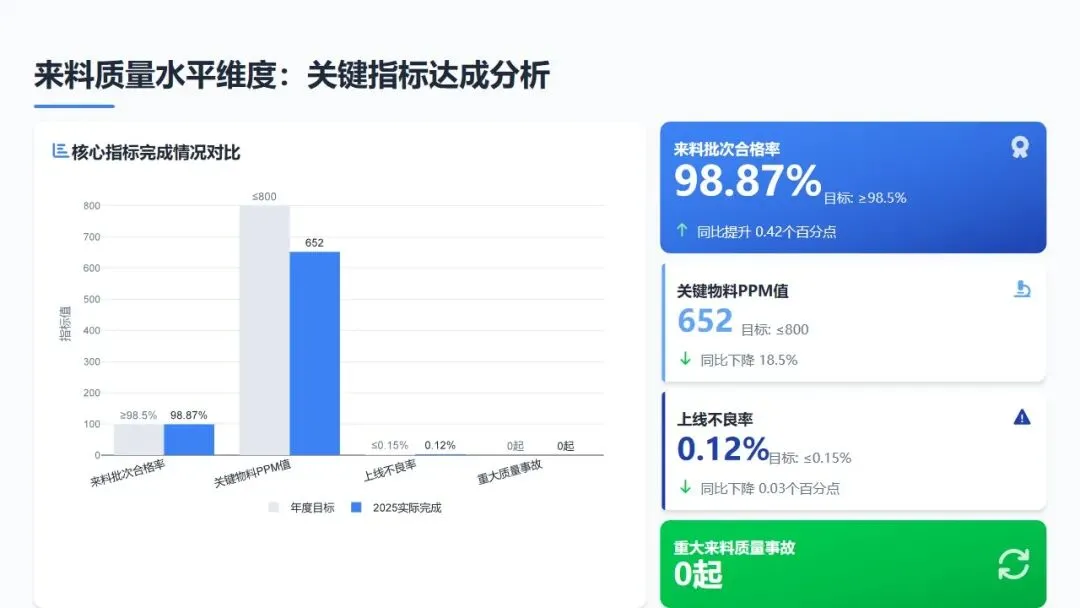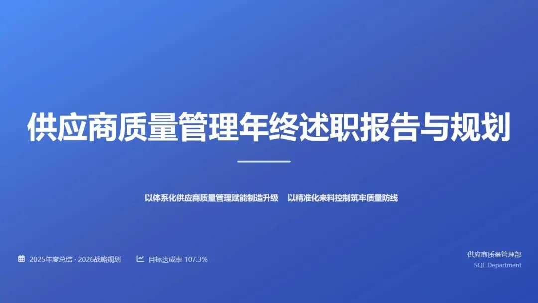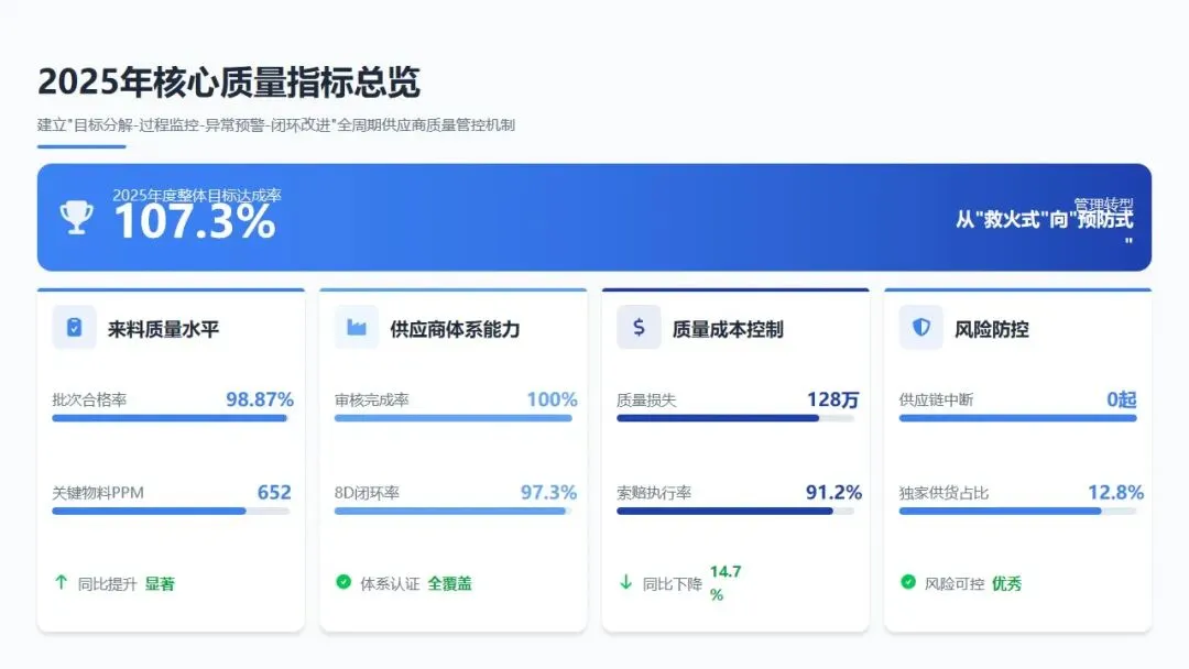 2025年,供应商质量管理部(SQE)紧扣公司"质量攻坚年"战略部署,建立"目标分解-过程监控-异常预警-闭环改进"的全周期供应商质量管控机制,围绕来料质量水平、供应商体系能力、质量成本控制、风险防控四大维度设定核心指标,整体目标达成率107.3%,实现供应商质量管理从"救火式"向"预防式"的关键转型。