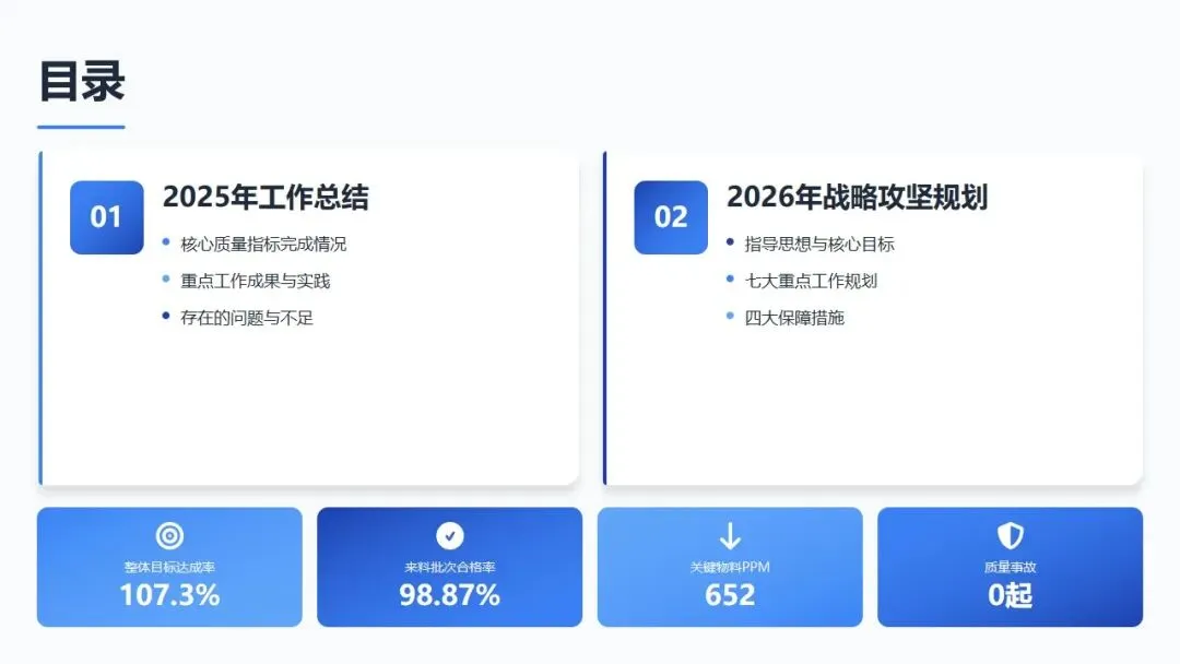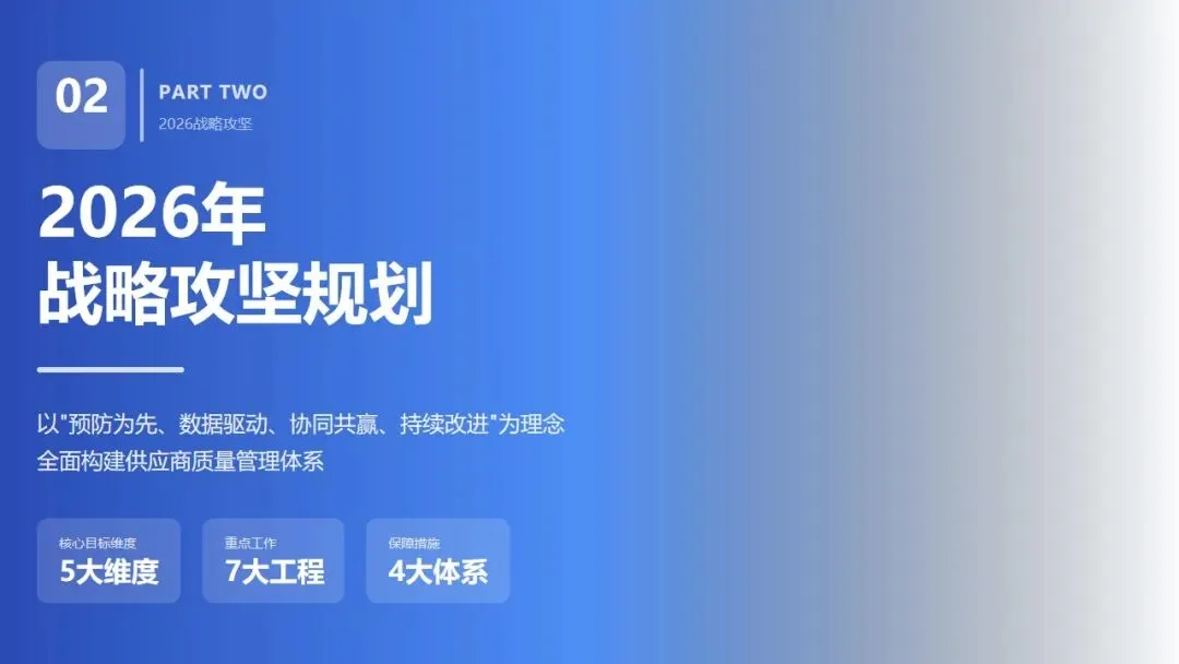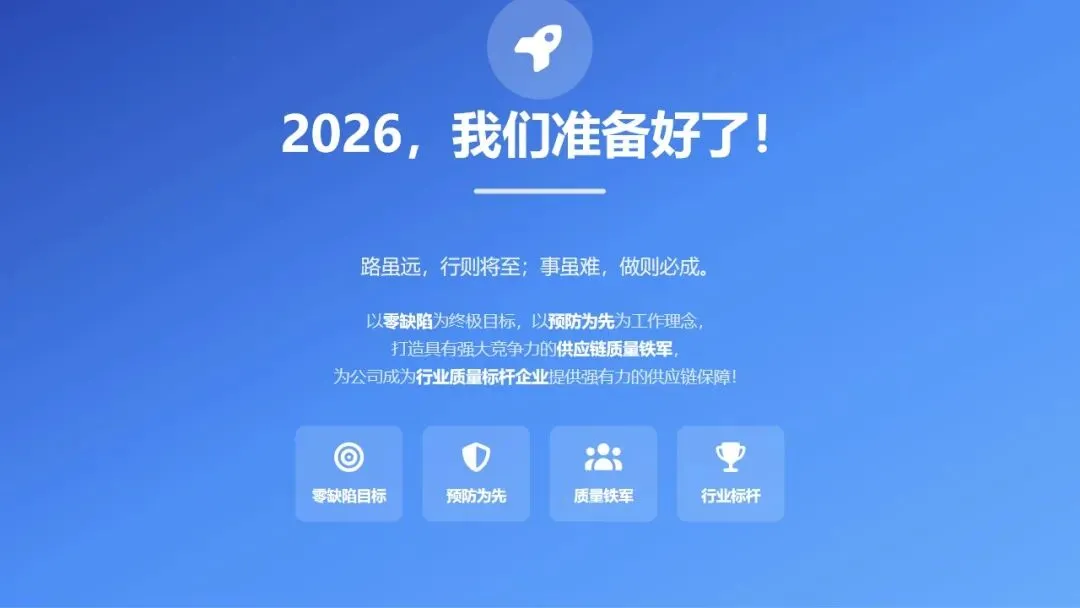 2026年,我们将以"零缺陷"为终极目标,以"预防为先"为工作理念,以"分级管理、预防体系、能力提升"为三大抓手,持续推进供应商质量管理的系统化、精细化、深度化。我们将以更加开放的心态与供应商建立互利共赢的伙伴关系,以更加严格的标准筑牢来料质量防线,以更加专业的能力支撑公司战略目标的实现。