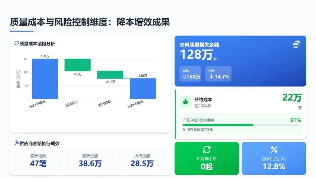 联合生产、计划部门,量化来料不良导致的计划调整、产能浪费、交期延误等隐性损失,纳入供应商绩效考核与索赔范围;建立"质量损失月度复盘会",分析TOP3损失来源,制定针对性改进措施。