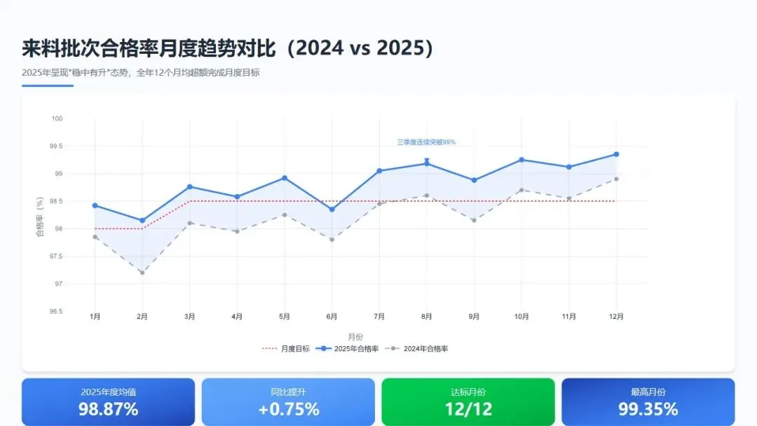 数据分析:2025年来料批次合格率呈现"稳中有升"态势,全年12个月均超额完成月度目标。特别在三季度(7-9月)实现连续三个月突破99%,这与该季度推行的"供应商质量预警机制"及"来料免检试点"直接相关。2月份受春节假期影响,2024年出现明显波动(97.20%),而2025年通过节前供应商备货审核与假期应急响应机制,将合格率稳定在98%以上,体现风险预防能力显著提升。