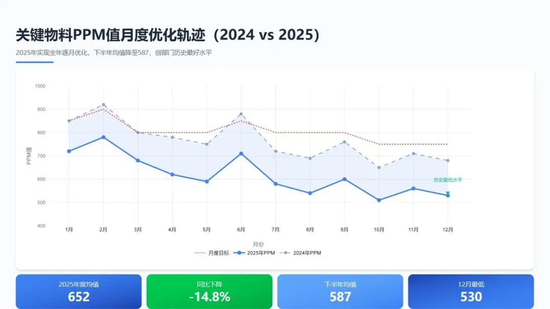 数据分析:关键物料PPM值在2025年实现全年逐月优化,特别是下半年(7-12月)均值降至587,较上半年均值下降12.3%。10-12月连续三个月PPM值低于550,创部门历史最好水平。这一改善源于对TOP10高频不良物料的专项攻关,以及供应商现场驻场辅导机制的实施。值得注意的是,2月份PPM值仍达780,虽同比改善但处于年度高位,主要受假期后供应商复工质量波动影响,提示节后供应链质量管理仍需强化。