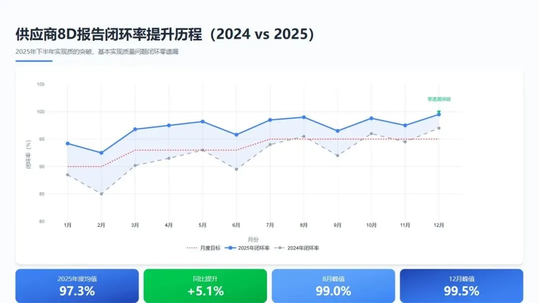数据分析:8D报告闭环率在2025年下半年实现质的突破,8月、12月分别达99.0%和99.5%,基本实现了质量问题闭环零遗漏。这一改善得益于"8D报告质量评级制度"的实施,将原本仅考核"提交及时率"升级为"有效性验证+防再发措施落地"双维度考核。同时,建立"超期8D预警看板",对超期3天未闭环的案例自动升级至部门经理督办,显著提升供应商整改响应速度。