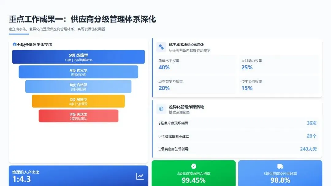 差异化管理策略落地:针对S级战略供应商(共12家,占采购额45%),实施"联合质量改进计划",全年开展现场质量辅导36次,协助建立SPC过程控制点28个,推动3家供应商导入精益生产项目。针对C级观察供应商(共8家),实施"质量提升百日攻坚",派驻SQE工程师驻场辅导累计240人天,其中5家成功晋级B级,2家因持续改进无效启动淘汰程序。