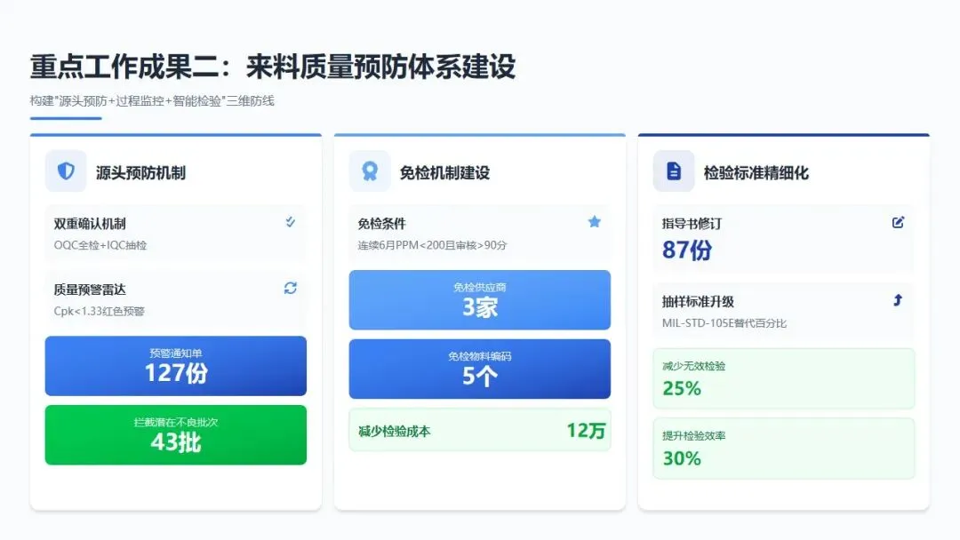 免检机制与信任建设:针对连续6个月PPM<200且审核得分>90分的S级供应商,试点"来料免检"政策,全年共对3家供应商的5个物料编码实施免检,减少检验成本12万元,同时释放IQC人力投入至新供应商开发验证。建立免检供应商"飞行检查"机制,全年开展突击检查18次,未发现系统性质量滑坡,验证免检机制有效性。