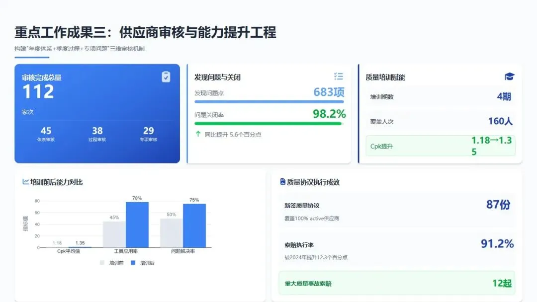 开展供应商质量能力年度审计,验证培训效果、工具应用、过程能力提升的可持续性;对全年能力提升显著的供应商颁发"质量进步奖",对退步供应商进行约谈并制定帮扶计划。