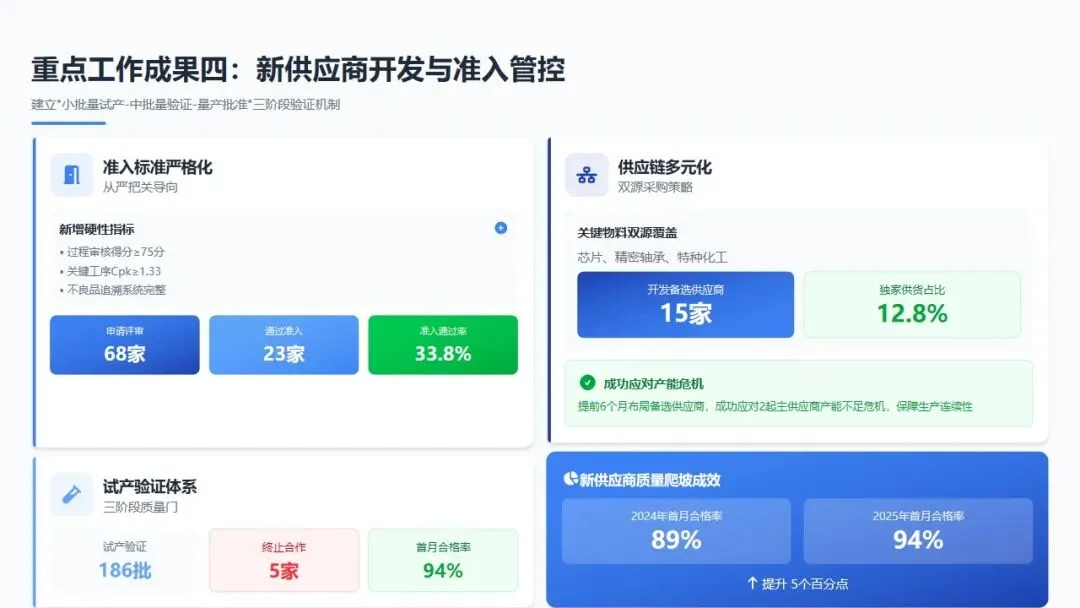 准入标准严格化:提高新供应商准入门槛,新增"过程审核得分≥75分""关键工序设备能力指数≥1.33""不良品追溯系统完整性"等硬性指标。全年共评审新供应商申请68家,通过准入23家,准入通过率33.8%,较2024年降低12个百分点,体现"从严把关"导向。