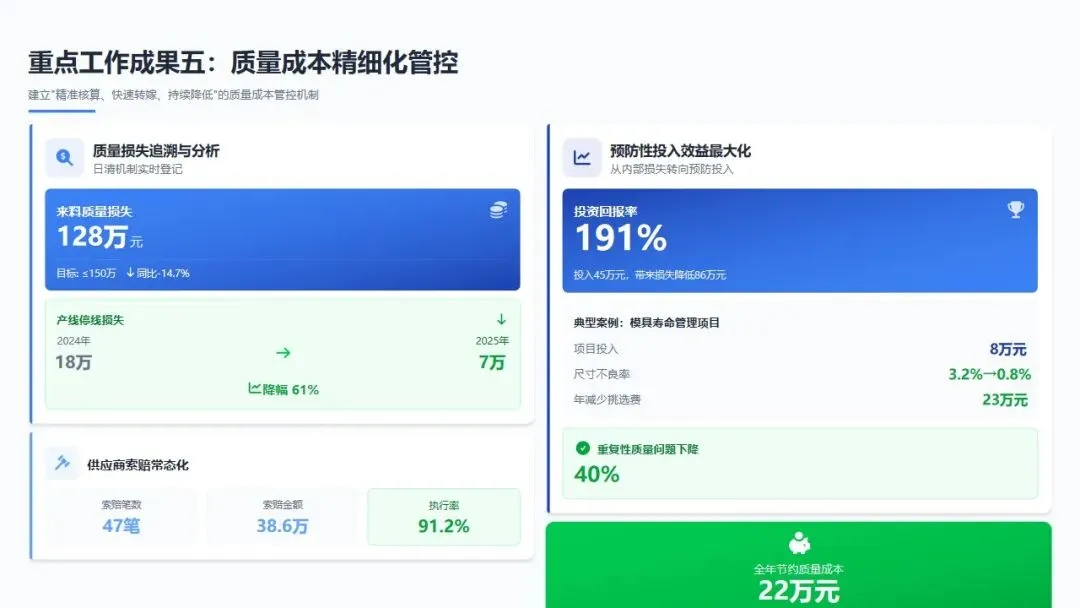 预防性投入效益最大化:将质量成本管控重心从"内部损失"转向"预防投入",全年投入供应商质量改进项目资金45万元(用于驻场辅导、检测设备校准、质量培训等),带来质量损失降低86万元,投资回报率191%。其中,对精密铸造供应商的模具寿命管理项目投入8万元,带来该供应商来料尺寸不良率从3.2%降至0.8%,年减少挑选费用23万元。