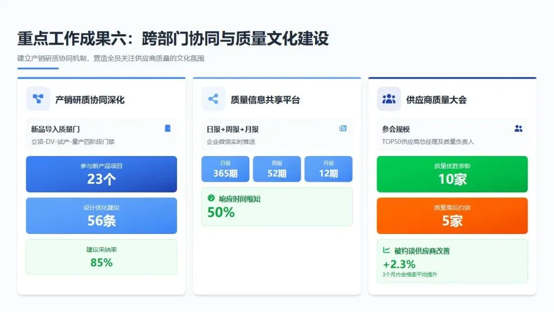 供应商质量大会:组织召开"2025年度供应商质量大会",邀请TOP50供应商总经理及质量负责人参会,发布《供应商质量白皮书》,表彰质量优胜供应商10家,约谈质量落后供应商5家,树立"质量第一"的合作导向。会后跟进显示,被约谈供应商在3个月内质量合格率平均提升2.3个百分点,整改有效率100%。