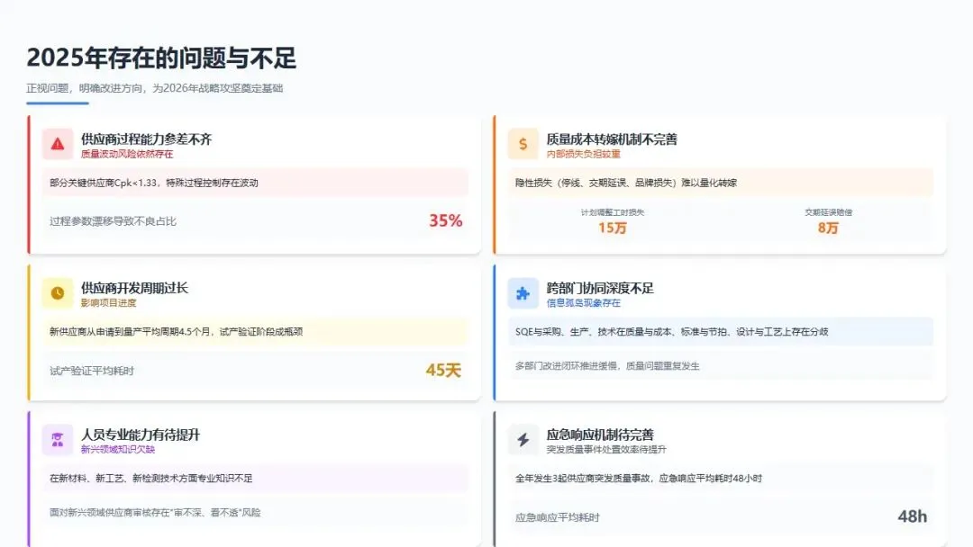 2025年,供应商质量管理部在来料质量提升、供应商体系能力建设、质量成本管控等方面取得了阶段性成果,为公司的稳健运营提供了坚实的供应链质量保障。然而,我们也清醒地认识到,在供应商过程稳定性、质量成本转嫁、应急响应速度、跨部门深度协同等方面仍存在明显短板,这些问题若不能得到有效解决,将成为制约公司高质量发展的瓶颈。