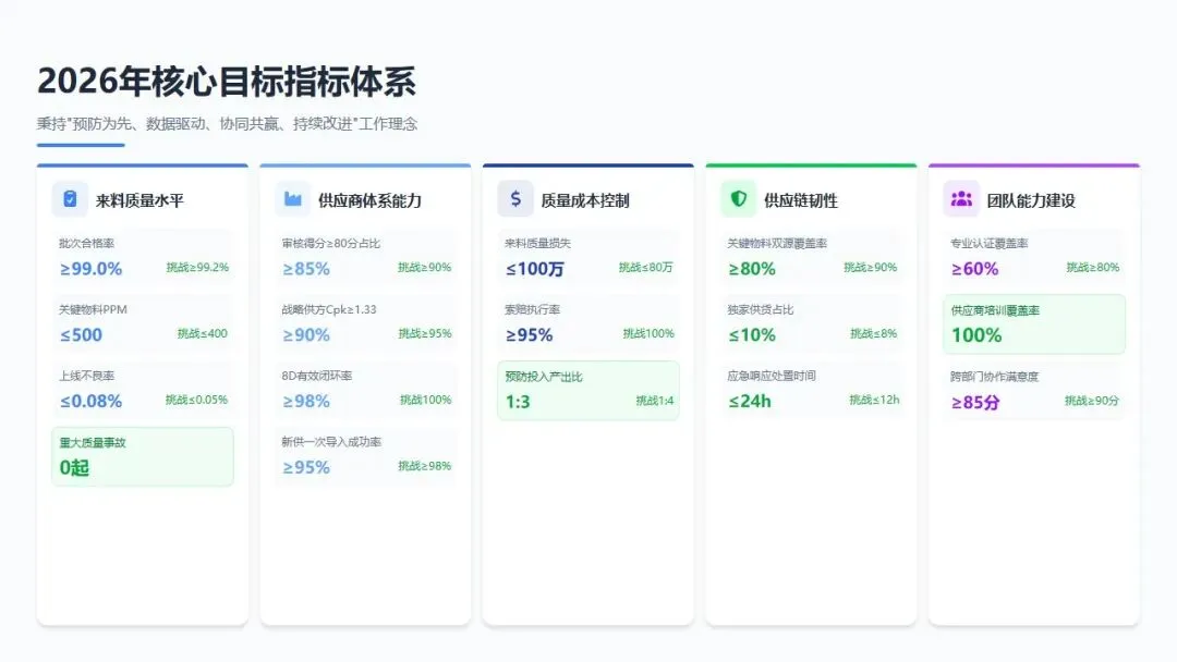 2026年,供应商质量管理部将以公司"精益制造、高质量发展"战略为指引,秉持"预防为先、数据驱动、协同共赢、持续改进"的工作理念,以供应商分级精细化管理为抓手,以来料质量零缺陷为目标,以供应链韧性建设为保障,全面构建"源头严防、过程严管、后果严惩"的供应商质量管理体系,为公司产品竞争力提升与市场份额扩张提供坚实的供应链质量保障。
