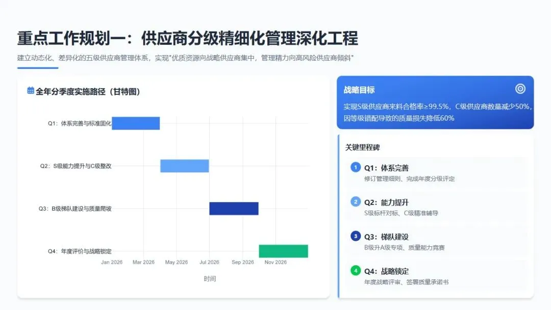 预期成效:通过全年动态分级管理,实现S级供应商来料合格率≥99.5%,C级供应商数量减少50%(从15家减至8家以下),因供应商等级错配导致的质量损失降低60%。