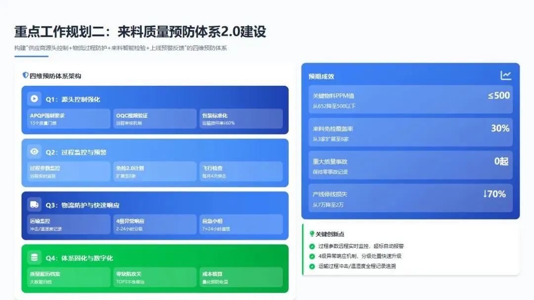 预期成效:通过四维预防体系,实现关键物料PPM值从652降至500以下,来料免检覆盖率达30%,重大来料质量事故零发生,因来料问题导致的产线停线损失降低70%。