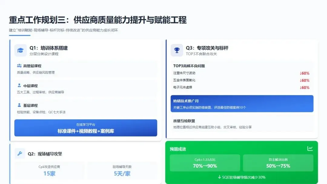 预期成效:通过全年赋能工程,实现核心供应商Cpk≥1.33占比从当前的70%提升至90%,供应商自主解决质量问题的比例从50%提升至75%,SQE驻场辅导频次减少30%(供应商自立能力提升)。