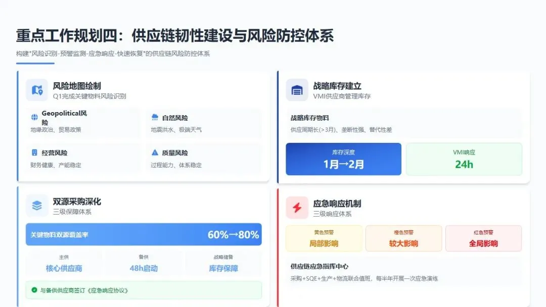 战略目标:构建"风险识别-预警监测-应急响应-快速恢复"的供应链风险防控体系,确保在任何突发情况下,关键物料供应不中断、质量不降级。